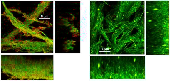 High-magnification confocal micrographs of viability-stained 48-hour-old chamber-grown Mucispirillum schaedleri biofilm (left) and flowcell-grown biofilm (right). Rectangular panels beneath and to the right of the main (square) image are side-on views. Supplementary Videos S1–S4 show the series of z-planes through the samples.