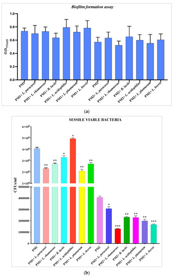 The data obtained (Figure 1b) confirmed that the number of CFUs/mL of PM1 and PM2 decreases significantly in the presence of the different strains of Lactobacillus, with the exception of L. acidophilus, which does not seem to have the ability to contrast the formation of biofilms by PM1.