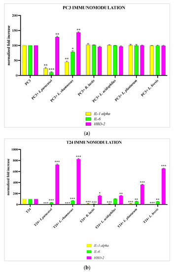 PC3 and T24 cells were treated for 6 h with the different strains of lactobacilli, and after this time, the strains were tested for their immunomodulatory activity by analyzing the gene expression of IL-6, IL-1α, and HBD-2. Our data demonstrate that for PC3, only two strains, L. paracasei and L. rhamnosus, are able to significatively downregulate the expression of pro-inflammatory cytokines and to upregulate the expression of HBD-2, whereas for T24, all strains analyzed have shown anti-inflammatory and immunomodulatory activity (Figure 2a,b).