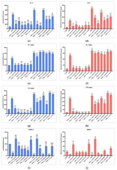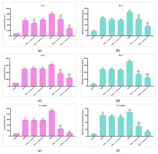 Comparison between relative gene expression (a,c,e,g,i) and protein concentration (b,d,f,h,j) in T24 cells infected with PM1 and PM2 with or without Lactobacillus spp. Data are representative of three different experiments ± SD. Significant differences are indicated by * p < 0.05, ** p < 0.01, *** p < 0.001 for comparison with respect to untreated cells (CTRL) arbitrarily assigned to 100, or # p < 0.05, ## p < 0.01, ### p < 0.001 for comparison with respect to PM1 or PM2 alone.