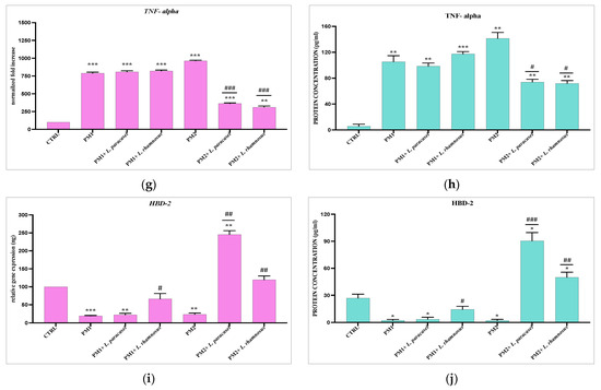 The presence of IL-6, IL-8, IL-1α, TNF-α, and HBD-2 in cellular supernatants was analyzed using enzyme-linked immunosorbent assay (ELISA; Elabscience Biotechnology Inc., Houston, Texas, USA; Phoenix Pharmaceuticals, Inc., Burlingame, CA 94010, USA). Briefly, the cell culture supernatants were collected and centrifuged at 1000× g for 20 min to eliminate cell debris. Then, 100 μL conditioned medium was added to the appropriate wells and incubated at 37 °C for 90 min. Thereafter, the liquid was decanted, the biotinylated detection antibody working solution was added to the wells, and the mixture was incubated at 37 °C for 60 min. The wells were washed 3 times with wash buffer, the HRP conjugate working solution was added, and the wells were incubated at 37 °C for 30 min. Then, the wells were washed 5 times with wash buffer, and the substrate reagent was added for 15 min. The stop solution was added to the wells, and the OD values were determined at 450 nm [40].