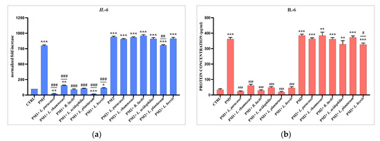 For lactobacilli screening, semiconfluent monolayers were infected with 108 CFUs/mL of different Lactobacillus strains at a multiplicity of infection (MOI) of 100 [36,37,38] for 6 h at room temperature at 37 °C. For evaluation of activity of probiotics against P. mirabilis, cells were infected with exponentially growing PM1 and PM2 at an MOI of 100 bacteria/cell, with or without selected Lactobacillus strains. Infection was carried out for 6 (for gene expression analysis) and 24 h (for ELISA assay) at 37 °C in 5% CO2.