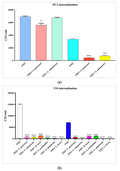 PM1 and PM2 invasion assays in PC3 (a) and T24 (b) cells alone or in the presence of Lactobacillus spp. Number of viable cell-associated bacteria was determined by host cell lysis, plating, and counting of CFUs/mL. Data are representative of three different experiments ± SD. Significant differences are 540 indicated by * p < 0.05, ** p < 0.01, *** p < 0.001.