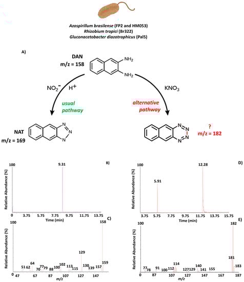 - Wada, M.; Morinaka, C.; Ikenaga, T.; Kuroda, N.; Nakashima, K. A Simple HPLC-Fluorescence Detection of Nitric Oxide in Cultivated Plant Cells by in situ Derivatization with 2,3-Diaminonaphthalene. Anal. Sci. 2002, 18, 631–634. [Google Scholar] [CrossRef] [PubMed][Green Version]