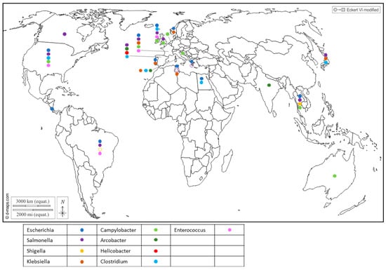 Worldwide distribution of bacterial genera frequently detected in BMS (freshwater or marine) per country. Full circles show the detection of bacteria in a country (by isolation or PCR), according to the color code in the legend (blue: Escherichia; purple: Salmonella; yellow: Shigella; brown: Klebsiella; light green: Campylobacter; dark green: Arcobacter; red: Helicobacter; light blue: Clostridium; pink: Enterococcus). Empty circles report that the bacterium was assessed but never detected in the country, following the same color code. Up to 5 different genera were detected in a single country. References reporting each detection are listed per country in Supplementary Table S1.
