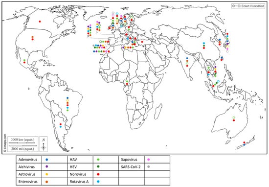The first attempts to detect human viruses in BMS relied on virus cultivation in mammalian cells, which allowed culturable viruses such as enteroviruses [] or hepatitis A virus [] to be identified. Since the 1990s, progress in molecular biology has enabled the identification of many other human viruses in BMS worldwide (Figure 2 and Supplementary Table S2) through conventional PCR, PCR and probe hybridization, quantitative PCR and, more recently, digital PCR. Most of these human viruses are considered to be enteric pathogens and known to be present in the stool of infected individuals and in human sewage []: adenovirus (AdV), aichivirus (AiV), astrovirus (AsV), enterovirus (EV), hepatitis A virus (HAV), hepatitis E virus (HEV), norovirus (NoV GI, GII, GIV), rotavirus A (RV) and sapovirus (SaV). Other non-enteric viruses that are present in human excreta were also detected in BMS, such as SARS-CoV-2 (Figure 2 and Supplementary Table S2), human polyomavirus JC [,] and the Merkel-cell polyomavirus []. In addition to these well-known human viruses, human bocaviruses, which are emerging enteric and/or respiratory viruses first identified in 2005 and are present in human sewage, were detected in BMS in all of the studies in which they were assessed [,,,,], including in Italy, South-Africa, Thailand and Brazil. Human circoviruses, another group of recently discovered ubiquitous viruses also present in human stools, were detected in BMS in Norway [].
