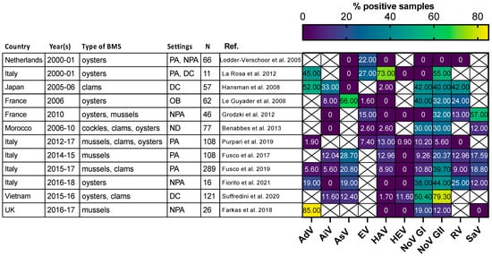 Comparison of enteric virus frequency in BMS screened for multiple viruses in 11 studies. The proportion of samples positive for each studied virus (x-axis) in 11 studies (y-axis) is plotted as a heatmap. Studies were selected for assessing at least 5 different enteric viruses through conventional or quantitative PCR. They were conducted in the Netherlands, Japan, France, Morocco, Italy, Vietnam and UK at different periods between 2000 and 2018. Different types of BMS (Oysters, mussels, clams and cockles) were sampled either from areas not open for production (NPA), producing areas (PA), the distribution chain (DC), which includes dispatch centers, retails, markets or restaurants, or in relation to human outbreak investigation (OB). In one case the setting was not disclosed (ND). The number of studied samples varied from 11 to 289. Human AdV and EV were consistently detected, with varying frequencies. Human NoV (GI, GII or both) were detected in all studies but one and often displayed the highest or second highest frequency. Other viruses were detected at lowest frequencies and remained undetected in some of them. References cited [,,,,,,,,,,,].