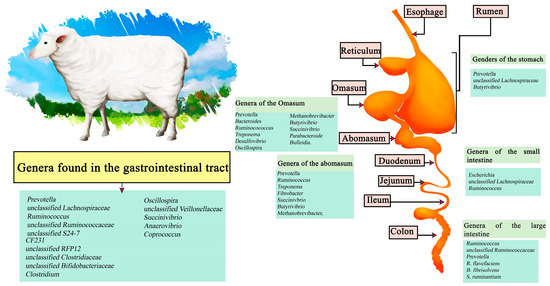 The sheep meat market includes the sale of meat, milk, wool, and skin, depending on the country of origin. Worldwide, there are an estimated 1 billion sheep, distributed mainly in northern Europe, Asia, South America, Australia, and New Zealand, with a consumption of 2.5 kg per person per year. In general, sheep production systems are classified into 3 categories: extensive production, intensive production, and traditional grazing; the latter has been reduced mainly due to the advance of agriculture that has reduced the available space, in addition to problems in yield [59]. In sheep studies the predominant microorganisms in the regions encompassing the sheep stomach have been Prevotella, unclassified Lachnospiraceae, and Butyrivibrio. In the abomasum these are Prevotella, Ruminococcus, Treponema, Fibrobacter, Succinivbrio, Butyrivibrio, and Methanobrevibacter, while in the Omasum Prevotella, Bacteroides, Ruminocococcus, Treponema, Desulfovibrio, Oscillospira, Methanobrevibacter, Butyrivibrio, Succinivibrio, Parabacteroide, and Bulleidia have been described. On the other hand, the three most dominant genera in the small intestine are Escherichia, unclassified Lachnospiraceae, and Ruminocococcus; in the small intestine Ruminocococcus, unclassified Ruminococcaceae and Prevotella. R. flavefaciens, B. fibrisolvens and S. ruminantium are found. Predominant throughout the gastrointestinal tract are the genera of Prevotella, unclassified Lachnospiraceae, Ruminococcus, unclassified Ruminococcaceae, unclassified S24-7, CF231, unclassified RFP12, unclassified Clostridiaceae, unclassified Bifidobacteriaceae, Clostridium, Oscillospira, unclassified Veillonellaceae, Succinivibrio, Anaerovibrio, and Coprococcus (Figure 2) [60,61].