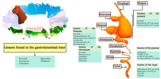 Goats are small ruminants that have been domesticated since ancient times; their uptake is more popular in the East and reduced in the West. However, they have been gaining more relevance recently [71]. The cause of their popularity is due to the healthier nutritional qualities present in goat meat (Chevon), containing a lower level of fat, saturated fat and cholesterol. It also has a higher content of polyunsaturated fatty acids (PUFA), being healthier than other red meats [72]. Among the genera identified in the stomach are Prevotella, Rikenellaceae_RC9_gut_group, and Christensenellaceae_R-7_group. Meanwhile, the abomasum is composed of Prevotella, ruminocococcus, Clostridium, butyrivibrio, and fibrobacter, followed by, in the omasum, Prevotella_1, Christensenellaceae_R-7, Ruminocococcaceae_NK4A214, Lactobacillus, Christensenellaceae_R-7, Succiniclasticum, Clostridiales_vadinBB60, and Clostridiales_vadinBB60. The jejunum section is dominated by Romboutsia, WCHB1-41_ge, p-1088-a5_gut_group, and Christensenellaceae_R-7_group. Finally, the large intestine region presents a higher abundance of the genera Rikenellaceae_RC9_gut_group, Bacteroides UCG-010_ge, UCG-005, and Alistipes [73]. In contrast, along the intestine the main genera involved are Prevotella, ruminococcus, Clostridium, Butyrivibrio, and Fibrobacter (Figure 3) [74,75].