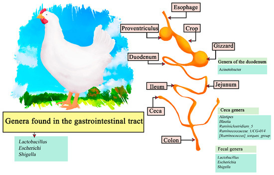 The digestive system of poultry consists of the oral cavity (beak), esophagus, crop, stomach (constituted of two parts; proventriculus and gizzard), small intestine (composed of duodenum, jejunum and ileum), liver, cecum, large intestine, and cloaca (Figure 4). The ingested food is hydrated, ground into small particles, acidified and attacked by endogenous enzymes to obtain the macronutrients. The stomach has oxyntopeptic cells responsible for secreting both hydrochloric acid and pepsinogen, and lipase resulting from reflux from the duodenum can also be found. The functions of the proventriculus and gizzard (ventriculus) are, respectively, to initiate primary digestion using digestive enzymes and to exert a mechanical function by grinding the food to a suitable size to continue through the digestive tract [89,90]. The pH values present in some areas of the digestive system are: beak (6.7); crop (6.4); ileum (6.7); rectum (7.1). As described, the pH in chickens is more acidic than in other mammals and does not change during the life span. On the other hand, the constituent microorganisms of the microflora are obtained by the interaction of newly hatched chicks and the eggshell surface, changing over time [91]. It has been recorded that Clostridium_sensu_stricto_1 is predominant in newly hatched chicks in the cecum, duodenum, and feces. However, Lactobacillus is more abundant in later stages such as after 35 days. Therefore, the genera found in feces are lactobacillus and Escherichia-Shigella, in the cecum Alistipes Blautia, Ruminiclostridium_5, Ruminococcaceae_UCG-014, and the [Ruminococcus]_torques_group, and finally the genus Acinetobacter in the duodenum [92]. Among the most recurrent genera within the gastrointestinal tract are Lactobacillus, Escherichi, and Shigella (Figure 4) [93].