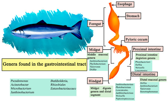 The Atlantic Salmon (Salmo salar) is carnivorous in nature, with Norway and Chile being its main producers [126]. Its gastrointestinal system is composed of an esophagus, and a U-shaped stomach and intestine with the presence of pyloric caecae attached to it [127]. Although it is a carnivorous fish, it has been proposed to use diets from terrestrial plant sources to improve economic and environmental sustainability, causing farmed Atlantic salmon to change their diet. This has a direct impact on their microbiome, which exhibits variations based on whether their diet is carnivorous or vegetarian [128]. In samples of the digesta in the proximal intestine the most abundant genera were Photobacterium, Delftia, Weissella, and Leuconostoc. The genera Janthinobacterium, Photobacterium, Leuconostoc, Janthinobacterium, Weissella, and Peptostreptococcus were the most abundant in the digesta of the midgut and distal segment, and in the middle mucosa Janthinobacterium, Phyllobacterium, Variovorax, and Delftia, while Delftia, Janthinobacterium, Variovorax and Stenotrophomonas had a higher relative abundance in the distal mucosa. Represented as central microbiota of the salmon were the genera Pseudomonas, Acinetobacter, Microbacterium, Janthinobacterium, Burkholderia, members of Rhizobiales, and Enterobacteriaceaceace (Figure 6) [129].
