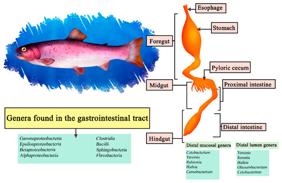The rainbow trout (Oncorhynchus mykiss) is a carnivorous fish of the freshwater Salmonidae family, noted for its reproductive efficiency and intestinal tract adaptable to feeding conditions [135]. It belongs to the Teleosts, so it shares characteristics in its intestinal morphology with other fish, presenting a stomach consisting of cardiac, fundic and pyloric regions, forming a J-shape, which by surface extension benefits enzymatic digestion [136]. It has been reported through sequencing that Cetobacterium, Yersinia, Ralstonia, Hafnia and Carnobacterium are the most abundant within the distal intestinal mucosa and Yersinia, Serratia, Hafnia, Obesumbacterium and Cetobacterium in the distal lumen [137]. In turn, other studies indicate that under a diet with insect protein directly related genera are Oceanobacillus, Bacillus, Paenibacillus and Cetobacterium within the intestines [138]. In the case of a central microbiota in Oncorhynchus mykiss it is difficult to describe since they encompass around 52 taxa in some studies, from among them we can highlight the classes Gammaproteobacteria, Epsilonproteobacteria, Betaproteobacteria, Alphaproteobacteria, Clostridia, Bacilli, Sphingobacteria and Flavobacteria (Figure 7) [139].