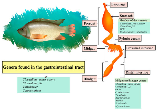 Nile tilapia (Oreochromis niloticus) is a freshwater fish native to Africa and the Middle East, being the second most cultured fish in the world [148]. Is omnivorous and with high plasticity focusing on phytoplankton, zooplankton detritus, and macrophytes [149]. It is part of the teleosts, consisting of a gastrointestinal gut consisting of the esophagus, Y-shaped stomach, and intestine [150]. It has been noted that Proteobacteria and Fusobacteria were the central phyla of intestinal microorganisms in tilapia, the most common genus being Cetobacterium within the inner, mid and hindgut [151]. Other studies focused on studying the stomach, midgut and hindgut segments, with sequenced luminal and mucosal samples, determining that the stomach section contains the genera Clostridium _sensu_stricto, Clostridium_XI, GPXI, Cetobacterium, and Turicibacter. The midgut region Clostridium _sensu_stricto, Clostridium _XI, GPXI, Cetobacterium, Turicibacterium, Cetobacterium, Cetobacterium, and Turicibacter, Cetobacterium, Turicibacter, Bacillariophyta, Bacillus, Romboutsia, and Mycobacterium. The hindgut Clostridium _sensu_stricto, Clostridium _XI, GPXI, Cetobacterium, Turicibacter, Bacillariophyta, Bacillus, Romboutsia, and Mycobacterium. The results indicate that Clostridium_sensu_stricto, Clostridium_XI, Turicibacter, and Cetobacterium are the core genera (Figure 8) [152].