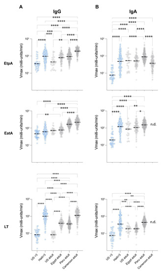 Immune responses to EtpA, EatA and LT in diverse populations. Shown are kinetic ELISA (IgG, (A)) data (IgA, (B)) with geometric mean values represented by dashed horizontal lines. p * < 0.05, ** < 0.01, *** < 0.001, **** < 0.0001 (Kruskal–Wallis nonparametric testing). n.d. no data due to insufficient quantity of sera for analysis.