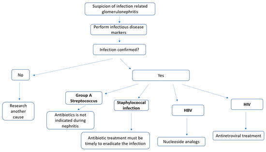 Based on the concept that understanding the pathogenetic mechanisms causing glomerular damage should guide treatment and the studies showing that infection-related glomerulonephritis responds well to infection control itself, with antibiotics, or with antivirals, the KDIGO 2021 guidelines suggest the use of targeted antibiotic therapy in bacterial forms with positive cultures and recommend the use of nucleoside analogs in HBV-related glomerulonephritis (HBV DNA > 2000 IU/mL) and antiretroviral treatment in all patients with HIV and kidney disease [20,93,94].