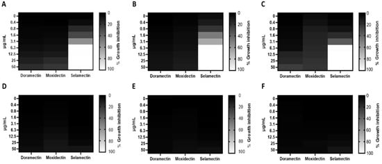Antibacterial potential of avermectin drugs. Heatmap representations of bacterial inhibition after treatment of S. aureus (A), C. striatum (B), S. epidermidis (C), E. coli (D), K. pneumoniae (E), and P. aeruginosa (F) with doramectin, moxidectin, selamectin (50–0.4 µg/mL) for 20 h. Vancomycin and meropenem were used as CTR+ for Gram-positive and -negative bacteria, while untreated bacteria were considered the CTR-. The p-value was <0.05.