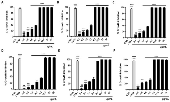 Antimicrobial potential of selamectin. Histogram representations of bacterial inhibition after treatment of (A) S. aureus ATCC 6538 (****: p-value < 0.0001, ***: p-value 0.0004, ns: not significant); (B) CI1 strain (****: p-value < 0.0001, ***: p-value 0.0005, ns: no significant); (C) CI2 strain (****: p-value < 0.0001, ***: p-value 0.0002, ns: not significant); (D) CI4 strain (****: p-value < 0.0001, **: p-value 0.0033, ns: not significant); (E) CI3 strain (****: p-value < 0.0001, ***: p-value 0.0002, ns: not significant); and (F) CI5 strain (****: p-value < 0.0001, ***: p-value 0.0004, **: p-value 0.0037) with selamectin (50–0.4 µg/mL) for 20h. Vancomycin was used as CTR+, while untreated bacteria were considered the CTR-. p-value < 0.05.