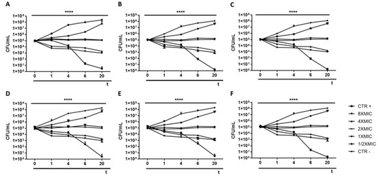 Killing kinetics of selamectin. Curve representations of bacterial load (CFU/mL)after treatment of S. aureus ATCC 6538 (A), CI1 (B), CI2 (C), CI4 (D) and CI5 (F) strains with selamectin at concentrations of 8 × MIC (50 µg/mL), 4 × MIC (25 µg/mL), 2 × MIC (12.5 µg/mL), 1 × MIC (6.3 µg/mL) and 1/2 × MIC (3.1 µg/mL) and of CI3 (E) strain with exposure of of 8 × MIC (100 µg/mL), 4 × MIC (50 µg/mL), 2 × MIC (25 µg/mL), 1 × MIC (12.5 µg/mL) and 1/2 × MIC (6.3 µg/mL) selamectin for 0, 1, 4, 6, and 20 h. Vancomycin was used as CTR+, while untreated bacteria were considered the CTR-. ****: p-value < 0.0001.