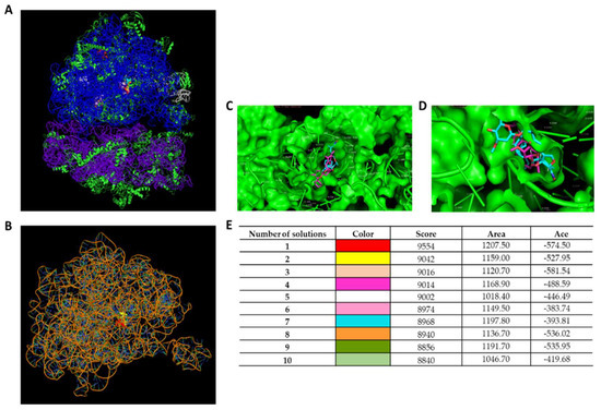 Binding interactions of selamectin with 23S RNA structure derived from a wild-type S. aureus. (A) Interactions between ribosome and selamectin; (B) interactions between 23S rRNA and selamectin; (C,D) ribosomal channel occupied by selamectin; and (E) different interaction models characterized by binding energy scoring.