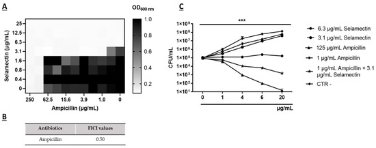 Synergistic activity of selamectin with ampicillin. (A) Heat plots of the combination effect of selamectin (25–0.4 μg/mL) with ampicillin (250–0.5 μg/mL) against CI5 strains, stimulated for 20h; CTR+ was untreated cells with drugs; p-value < 0.05. (B) Table with FICI value calculated for the combination selamectin/ampicillin. (C) Killing kinetic curves of bacterial load (CFU/mL) after treatment of CI5 strains with 6.3 and 3.1 μg/mL of selamectin, 125 and 1 μg/mL of ampicillin, and 1 and 3.1 μg/mL of ampicillin and selamectin, respectively. The untreated cell was used as CTR-. ***: p-value < 0.0003.