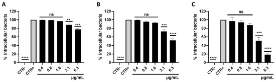 S. aureus is considered a facultative intracellular bacterium, surviving in the cell cytoplasm for varying periods of time. To evaluate the role of selamectin in counteracting the S. aureus intracellular survival in human keratinocytes, gentamicin protection assays were performed in the presence of the drug at concentrations ranging from 6.3 to 0.4 µg/mL. The effect of selamectin against intracellular MRSA followed a dose- and time-dependent trend. After 30 min of exposure, 6.3 and 3.1 µg/mL of the drug reduced the intracellular bacterial load by 22.5 and 11.8%, respectively (Figure 9A). Rates of 52 and 72.7% of bacteria relative to the CTR+ were detected, in response to treatment with selamectin at concentrations of 6.3 and 3.1 μg/mL for 1 h (Figure 9B). Drug exposure at doses of 6.3 and 3.1 µg/mL for 2 h reduced the intracellular bacterial load by 81.3 and 38.5%, respectively (Figure 9C). Non-significant differences compared to CTR+ were found in response to selamectin treatment at concentrations of 0.4, 0.8, and 1.6 μg/mL for different times of exposure, recording intracellular bacterial load rates higher than 87.7%, (Figure 9).