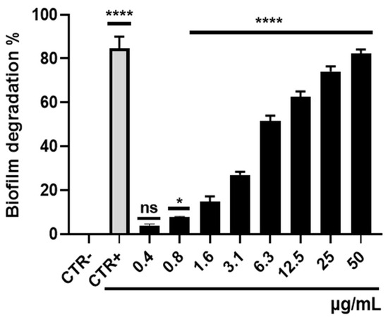 The potential of biofilm biomass disruption by selamectin. Histogram representations of biomass disruption after treatment of biofilm produced by S. aureus with selamectin (50–0.4 µg/mL) for 20h; untreated biofilm was CTR-, while vancomycin constituted the CTR+. ****: p < 0.0001; *: p < 0.005; ns: not significant, relative to drug solvent treated samples (CTR).