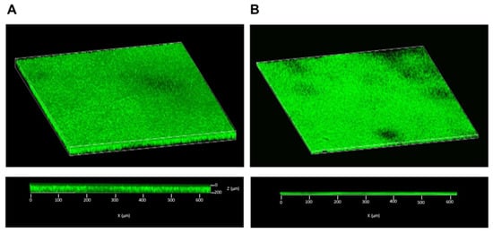 The capacity of S. aureus to establish disease-associated biofilms presents a serious challenge in eradicating bacteria from sites of infection. This is attributable to the high tolerance conferred by biofilms to antibiotic interventions, thereby fostering persistent and chronic infections. The impact of selamectin on the integrity of the mature S. aureus biofilm was evaluated (Figure 10). Biofilm biomass was quantified by the CV assay after treating the biofilm with 50–0.4 μg/mL of drug for 20 h. The treatment elicited a reduction of up to 82.3% in biomass at the highest concentration tested. At MIC concentrations, the S. aureus biofilm lost 51.5% of its mass compared to the drug solvent-treated biofilm. The extrapolated value of selamectin MBEC50 was 5.89 μg/mL. CLSM imaging of biofilms, treated with 6.3 µg/mL of selamectin, confirmed this finding. The images documented a thickness of the solvent and drug-treated biofilm equal to 22 and 8 μm, respectively (Figure 11A,B). A reduction in biofilm thickness of 63% and the appearance of lower-density regions occurred in response to treatment. No areas with cell mortality were detected, suggesting that the drug may have a bacteriostatic effect on the preformed S. aureus biofilm.