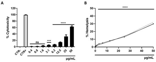 The assessment of selamectin’s cytotoxic effects was conducted on HaCaT cells and erythrocytes through the utilization of MTT and hemolysis assays, respectively. The range of selamectin concentrations investigated spanned from 50 to 0.4 μg/mL. In both assays, Triton-X (0.1%) and DMSO (100%) were employed as positive controls (CTR+), achieving complete lysis at a rate of approximately 100%. The cytotoxic influence of selamectin on the HaCat cell line increased in a dose-dependent manner, reaching a cell death rate of 63% at the highest concentration tested and a calculated CC50 value of 24.94 μg/mL (Figure 12A). Selamectin’s propensity to induce hemolysis was characterized by relatively modest rates, achieving lysis rates of 30% at the concentration of 50 μg/mL. This drug showed no relevant hemolytic activity at concentrations below 12.5 μg/mL (<8.07%) (Figure 12B).