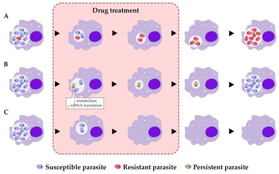 Types of response of protozoan parasites to a drug treatment. The responses of the parasites are shown in different periods of time during the drug treatment. (A) Response of resistant parasites. Susceptible parasites (purple) perish because of the drug treatment; in contrast, due to inherited mutations or molecular mechanisms such as translational reprogramming, resistant parasites (red) can survive and proliferate. (B) Response of persister-like parasites. A persister-like parasite (yellow) enters a dormancy state in the presence of the drug or other stresses and resumes proliferation only when the treatment is finished or the stress is removed. (C) Response of susceptible parasites. Susceptible parasites (purple) lack mechanisms to avoid the effects of the drug and die during the treatment.
