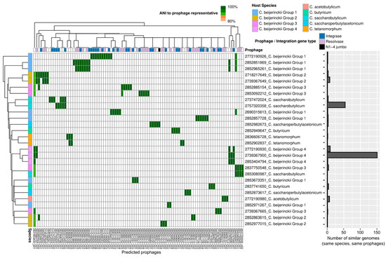 The other related Clade 1 C. aurantibutyricum, C. felsineum, and C. roseum species all contained prophage genomes of the integrase type of between 30,000 and 37,000 bp that contained a typical myovirus R-type structural cassette. Most of these genomes had reduced numbers of regulatory genes, and some were missing structural genes. One strain encoded a larger genome of 63,500 bp, headed by a Resolvase 146 gene, that also contained an R-type structural cassette. The C. pasteurianum strains that were investigated all encoded prophages with the standard R-type genomes of around 36,700 bp belonging to the integrase type. The C. tetanomorphum strains that were investigated all encoded prophages with the standard R-type genomes belonging to the Resolvase 146 type.