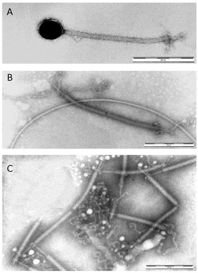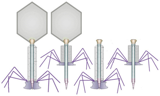 - Fokine, A.; Rossmann, M.G. Molecular architecture of tailed double-stranded DNA phages. Bacteriophage 2014, 4, e28281. [Google Scholar] [CrossRef]