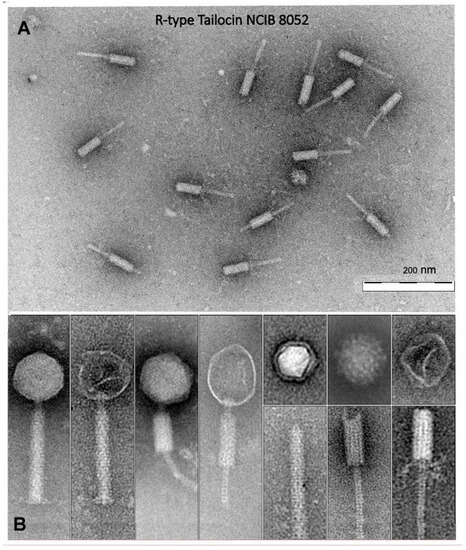 - Ghequire, M.G.K.; De Mot, R. The Tailocin Tale: Peeling off phage tails. Trends Microbiol. 2015, 23, 587–590. [Google Scholar] [CrossRef] [PubMed]