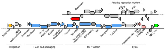 Although the prophage genomes, in many cases, showed very little overall DNA similarity, all these genomes exhibited a high level of similarity with respect to the function and order of the genes encoded by the prophage genome. The common genome framework is headed by an integration gene followed by the distal regulatory gene module. The regulatory gene module is then followed by a conserved myovirus R-type cassette of structural genes consisting of an integration module, a head gene module, a tail gene module, and a lysis gene module.