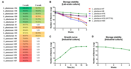 Storage stability tests. (A) Screening of bacterial strains isolated from Korean traditional fermented foods. (B) Survival of screened six bacterial strains (Log) grown in a lab-scale fermenter. (C) Growth curve of HY7718 in industrial tests. (D) Survival of HY7718 (Log) in industrial tests. L.D., Low detection (Week 1, <1 × 107 CFU; Week2, <1 × 105 CFU).
