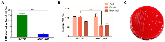 The ability of bacteria to adhere to the intestinal epithelium is a major precondition for the colonization of the digestive tract. To assess the ability of HY7718 to adhere to intestinal cells, we conducted an assay using Caco-2 cells. Figure 3A shows that 20.63 ± 0.88% and 3.34 ± 0.41%, respectively, of HY7718 and ATCC 14917 bacteria adhered to CaCo-2 cells (p < 0.001). These data suggest that HY7718 is able to colonize the digestive tract.