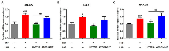 Effect of HY7718 on expression of MLCK pathway-related genes by TNF-induced Caco-2 cells. Levels of (A) MLCK, (B) Elk-1, and (C) NFKB1 mRNA. Results are presented as the mean ± SD. Significant differences are indicated as # p < 0.05 and ### p < 0.001 for untreated vs. TNF-treated cells, * p < 0.05 and *** p < 0.001 for TNF vs. probiotics, and ††† p < 0.001 for HY7718 vs. Type strain ATCC 14917. LAB: Lactic acid bacteria, TNF: TNFα, HY7718: Lactobacillus plantarum HY7718, ATCC 14917: Lactobacillus plantarum ATCC 14917, MLCK: Myosin light-chain kinase, Elk-1: ETS like-1, NFKB1: Nuclear factor kappa subunit.