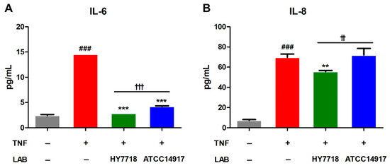 Effect of HY7718 on cytokines secretion by TNF-induced Caco-2 cells. The concentration of (A) IL-6 and (B) IL-8. Results are presented as the mean ± SD. Significant differences are indicated as ### p < 0.001 for untreated vs. TNF-treated cells, ** p < 0.01 and *** p < 0.001 for TNF vs. probiotics, and †† p < 0.01 and ††† p < 0.001 for HY7718 vs. Type strain ATCC 14917. LAB: Lactic acid bacteria, TNF: TNFα, HY7718: Lactobacillus plantarum HY7718, ATCC 14917: Lactobacillus plantarum ATCC 14917, IL-6: Interleukin-6, IL-8: Interleukin-8.