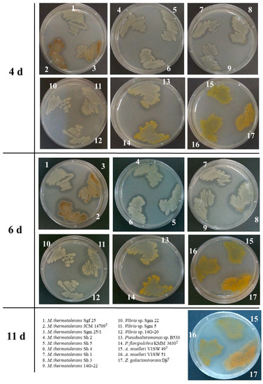 - Ivanova, E.P.; Shevchenko, L.S.; Sawabe, T.; Lysenko, A.M.; Svetashev, V.I.; Gorshkova, N.M.; Satomi, M.; Christen, R.; Mikhailov, V.V. Pseudoalteromonas maricaloris sp. nov., isolated from an Australian sponge, and reclassification of [Pseudoalteromonas aurantia] NCIMB 2033 as Pseudoalteromonas flavipulchra sp. nov. Int. J. Syst. Evol. Microbiol. 2002, 52, 263–271. [Google Scholar] [CrossRef]