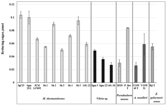- Miyazaki, M.; Nogi, Y.; Ohta, Y.; Hatada, Y.; Fujiwara, Y.; Ito, S.; Horikoshi, K. Microbulbifer agarilyticus sp. nov. and Microbulbifer thermotolerans sp. nov., agar-degrading bacteria isolated from deep-sea sediment. Int. J. Syst. Evol. Microbiol. 2008, 58, 1128–1133. [Google Scholar] [CrossRef]