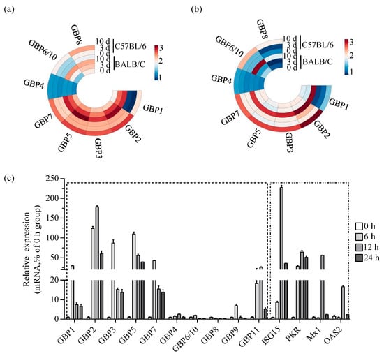 To provide a detailed analysis of the expression of GBP family members in ECTV-infected mouse tissues, a heat map was generated using transcriptome data that was made available by the laboratory online (https://www.ncbi.nlm.nih.gov/gds/, GSE100644 and GSE102850, accessed on 16 February 2018) []. It can be seen that most GBPs except GBP4 were strongly upregulated in BALB/c and C57BL/6 mice. Notably, the expression levels of genes located on chromosome 3 (GBP1, GBP2, GBP3, GBP5, and GBP7) were significantly higher than those on chromosome 5 (GBP4, GBP6/10, and GBP8). No expression of GBP9 and GBP11 was detected. The upregulation of GBPs was significantly higher in the infected versus non-infected group 10 days after infection (Figure 1a,b). The mRNA level ratio analysis indicated that the upregulation of GBP1 and GBP2 was significantly higher compared to other GBPs (Supplementary Table S3). However, the read value of GBP1 was lower than GBP2.
