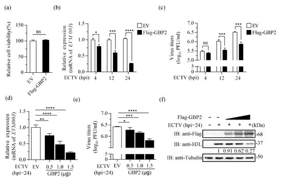 Overexpression of GBP2 inhibits ECTV replication. (a) The relative cell viability was measured using the CCK8 kit. (b,c) BSR-T7 cells were transfected with 1.5 μg/mL pcDNA3.1-Flag-GBP2 (Flag-GBP2) or the empty vector (EV) for 16 h. Afterwards, the cells were infected with ECTV (MOI = 1). At specified time points, the cell lysate and cell culture supernatant were harvested. The mRNA levels of EVM003 (b) and viral load (c) were measured using qRT-PCR and plaque assay, respectively. The viral mRNA relative expression, normalized to GAPDH, is presented as bar plots representing the mean ± S.D of technical repetition. (d–f) BSR-T7 cells were transfected with increasing doses of Flag-tagged GBP2 (0.5, 1.0, and 1.5 μg/mL) or the empty vector (1.5 μg/mL). The 0.5 and 1.0 μg/mL groups were supplemented with the empty vector to reach a final concentration of 1.5 μg/mL. After 16 h, cells were infected with ECTV (MOI = 1) for an additional 24 h. Samples were collected separately to determine the viral RNA transcripts (d), virus titer (e), and the expression of H3L protein (f). All three biological replicates showed similar results. * p < 0.1; ** p < 0.01; *** p < 0.001; **** p < 0.0001; ns, not significant.