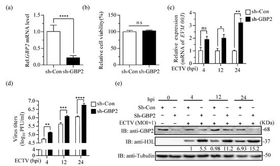 Knockdown of GBP2 enhances ECTV replication. (a) qRT-PCR analysis of GBP2 knockdown in sh-GBP2 and negative control (sh-Con) screening RAW264.7 cells. GAPDH was used as a loading control. (b) CCK8 tests of relative cell viability in sh-GBP2 and sh-Con screening RAW264.7 cells. (c–e) sh-GBP2 or sh-Con RAW264.7 cells were infected with ECTV at a MOI of 1 for 4, 12 and 24 h. The levels of viral mRNA, virus titers, and viral H3L protein expression were determined by RT-qPCR (n = 3) (c), plaque assay (n = 4) (d), and immunoblotting (e), respectively. Immunoblotting was performed to analyze cell lysates using antibodies against viral H3L protein and Tubulin. GBP2 antibody was used to detect the expression of endogenous GBP2 in RAW264.7 cells. * p < 0.1; ** p < 0.01; *** p < 0.001; **** p < 0.0001; ns, not significant.
