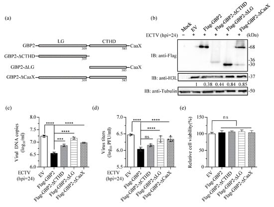 The deletion of the N-terminal LG domain of GBP2 led to the complete loss of its inhibition on ECTV. This provides further confirmation of the antiviral effect of GBP2 on ECTV. Interestingly, although the inhibitory function is diminished when the CaaX tail is removed, GBP2-ΔCTHD, which also lacks the CaaX motif, still retains its antiviral ability (Figure 4b–d). Previous research has demonstrated that a splice variant of hGBP3 (hGBP3-ΔC) with a modified C-terminal α-helical domain effectively resists influenza infection, unlike the full-length GBP3 []. Since most GBPs exert their effects through the large GTPase domain, it is speculated that the C-terminal α-helical domain may generally inhibit this activity. It is suggested that the targeting of CaaX to the endomembrane organelles could regulate the inhibition of GTPase activity by the C-terminus α-helical domain. Further investigation is required to gain a better understanding of this role.