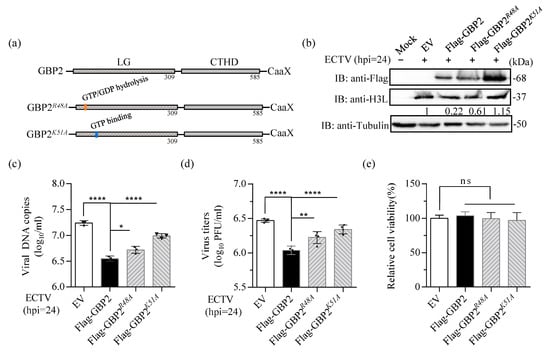 Previous studies have demonstrated the significance of Arg-48 (R48) and Lys-51 (K51) residues in the GTPase activity of GBP1, GBP2, and GBP5 [,,]. The R48 and K51 residues within the LG domain are critical for GBP2-mediated anti-MNV-1 activity []. GBP1K51A mutation was unable to inhibit IAV replication [], and the K51 of GBP1 is crucial for the inhibition of CSFV replication []. Hence, we created Flag-tagged mutants GBP2R48A and GBP2K51A to investigate the impact of mutant R48 and K51 of GBP2 on its antiviral effect on ECTV (Figure 5a). The two mutant plasmids were overexpressed, and the results revealed that the mutant GBP2K51A, which is defective in GTP binding, completely lost the ability to limit EVM003 amplification, the virus proliferation and protein expression. Conversely, the mutant GBP2R48A, which has a defect in GTP hydrolysis, only faintly reduced the effect on ECTV restriction (Figure 5b–d). Together, these results reveal that K51 of GBP2 is essential for its antiviral activity, which signify that the GTP-binding capacity is indispensable for GBP2 to limit ECTV replication.