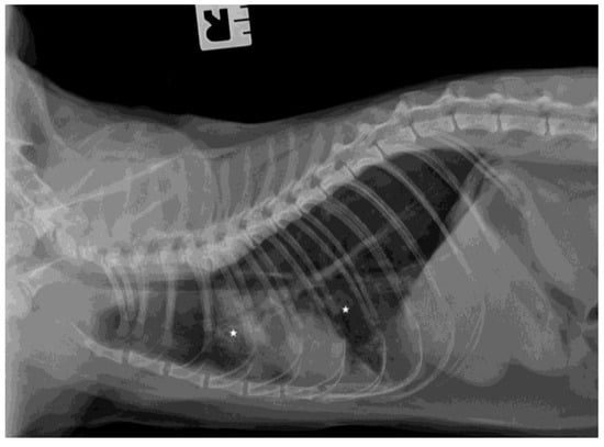 Imaging diagnostics of the thorax was performed in a short intravenous sedation with a combination of dexmedetomidine (Dexdomitor, 5 µg/kg b.w. i.v., Zoetis, Parsippany, New Jersey, USA) and butorphanol (Torphadine, 0.2 mg/kg b.w. i.v., Dechra, Northwich, Cheshire, UK). Ultrasound examination of the lungs and heart was performed using a Versana Premier, GE Medival System (Wuxi, Jiangsu, China) with a 12L-RS linear probe (frequency 10 MHz) and a microconvex 8C-RS ultrasound probe (8 MHz for the heart). X-ray examination of the chest was performed in two projections using an Ecoray-1060HF Portable X-ray Generator (Ecoray, Seoul, Republic of Korea).