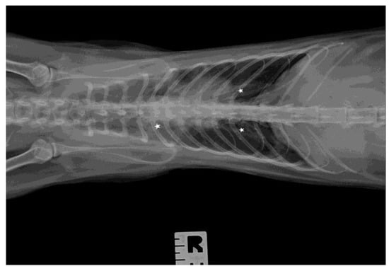 The thoracic X-ray image in the anteroposterior (AP) position. Parenchymal densities are visible in the middle and caudal fields of the lungs (asterisks indicate areas of lesions in the lungs).