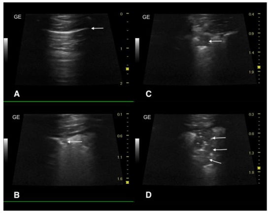 Ultrasonographic examination of the lungs. (A) Image of a healthy lung filled with air, the white arrow indicates the normal, smooth pleural line, (B) A small subpleural consolidation, with a diameter of approximately 1.5 mm (white arrow), (C) A subpleural consolidation of approximately 0.5 cm in size (white arrow), (D) Image of a consolidation involving a portion of the lung to the depth of approximately 1.8 cm, an aerated area of the affected lung is visible (white arrows).