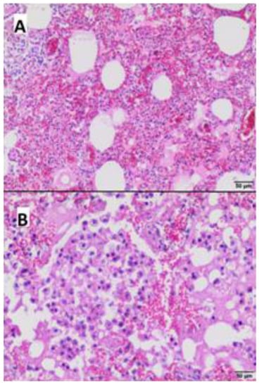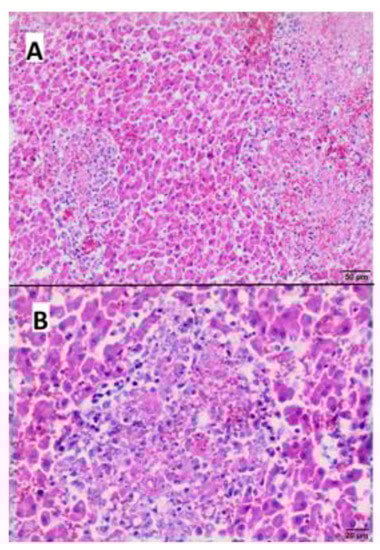 Histopathological examination of the liver—(A,B) areas of necrosis with inflammatory infiltrate composed of lymphocytes and histiocytes (Hematoxylin-eosin staining; (A) bar 50 µm; (B) bar 20 µm).