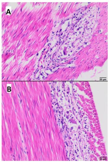 Histopathological examination of the intestinal wall. (A,B) vacuolization and necrosis of myenteric plexus cells with inflammatory infiltrate consisting of lymphocytes and histiocytes (Hematoxylin-eosin staining; (A) bar 20 µm; (B) bar 20 µm).