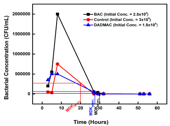 The tolerance of the biocide-exposed isolates was measured as the minimum duration for killing 99.99% (MDK99.99) of the BAC and the DADMAC-exposed isolates when treated with a very high ampicillin concentration. There was a decrease in the initial bacterial concentration of 2.5 × 108 CFU/mL to 2.5 × 104 CFU/mL on the second day, giving an MDK99.99 of 30 h for BAC 12 (Figure 1). For DADMAC-exposed isolates, the bacterial count dropped from 1.8 × 108 to 1.5 × 104 CFU/mL, giving an MDK99.99 value of 28 h (Figure 1). There was no reduction in the bacterial count of the controls.